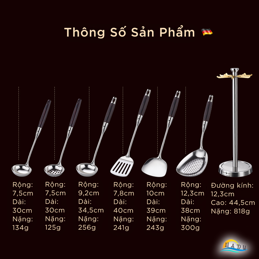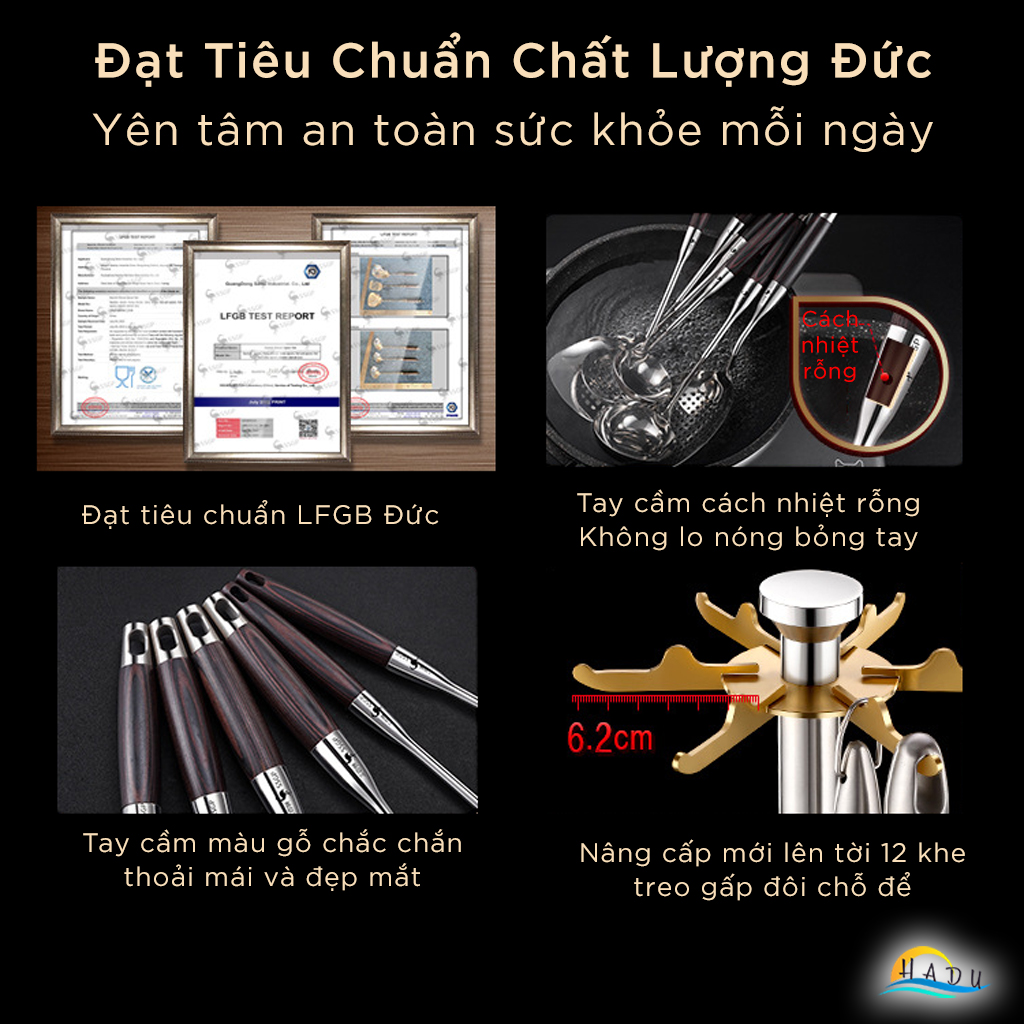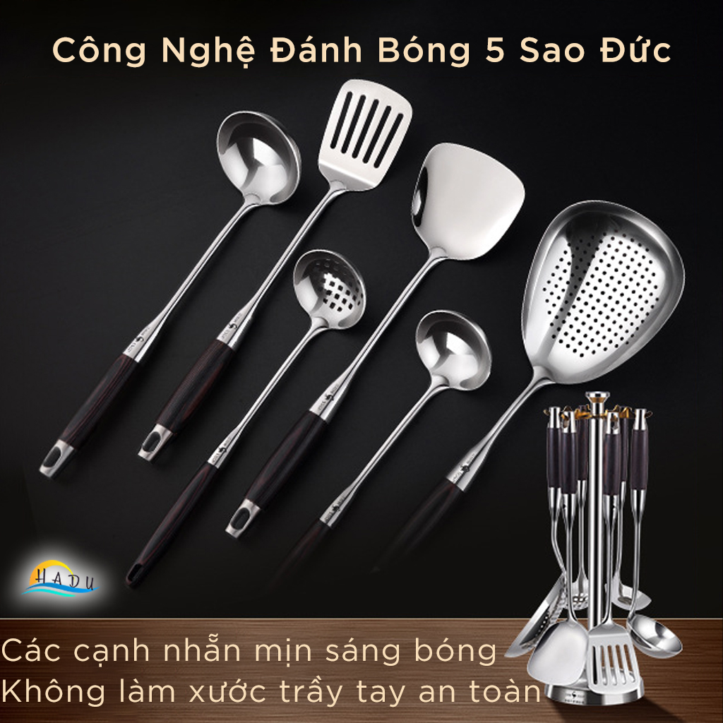 Bộ 6 Dụng Cụ Nấu Ăn SSGP Inox 316L, Kèm Giá Treo Xoay, Tay Cầm Cách Nhiệt, Đạt Chất Lượng LFGB Đức