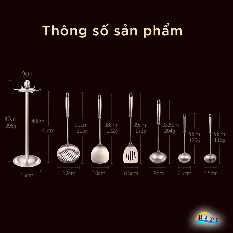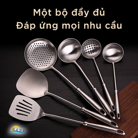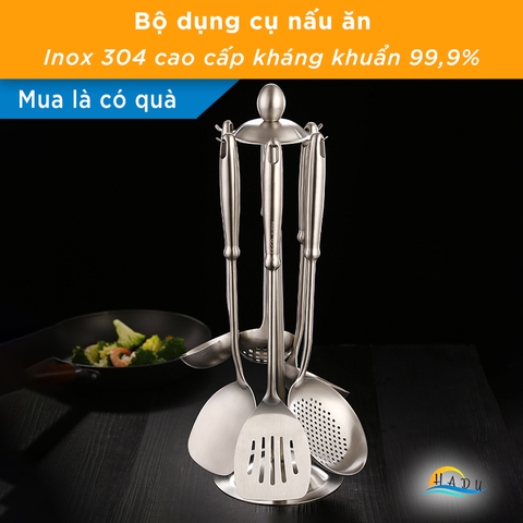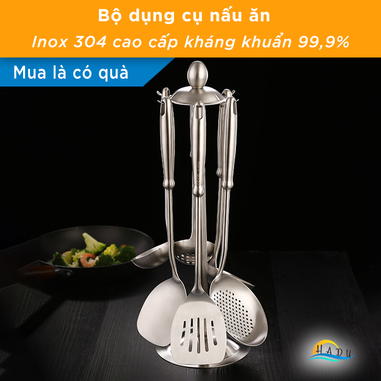 - Bộ dụng cụ nấu ăn từ inox 304 cao cấp nguyên khối chắc chắc bền đẹp đảm bảo an toàn, khỏe mạnh hơn.