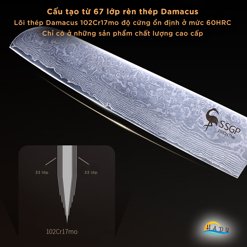 - Dao làm bếp cấu tạo từ 67 lớp rèn thép Damacus cao cấp cứng hơn gấp 4 lần thép thông thường..