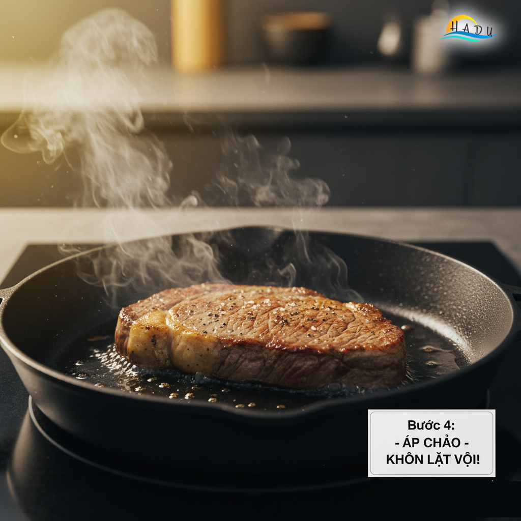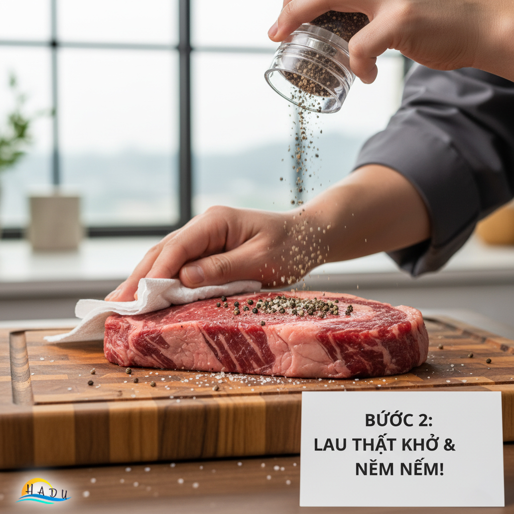 Lau khô: Dùng khăn giấy thấm khô hoàn toàn bề mặt miếng thịt. Bề mặt ẩm sẽ làm thịt bị "luộc" (steam) thay vì "áp chảo" (sear).