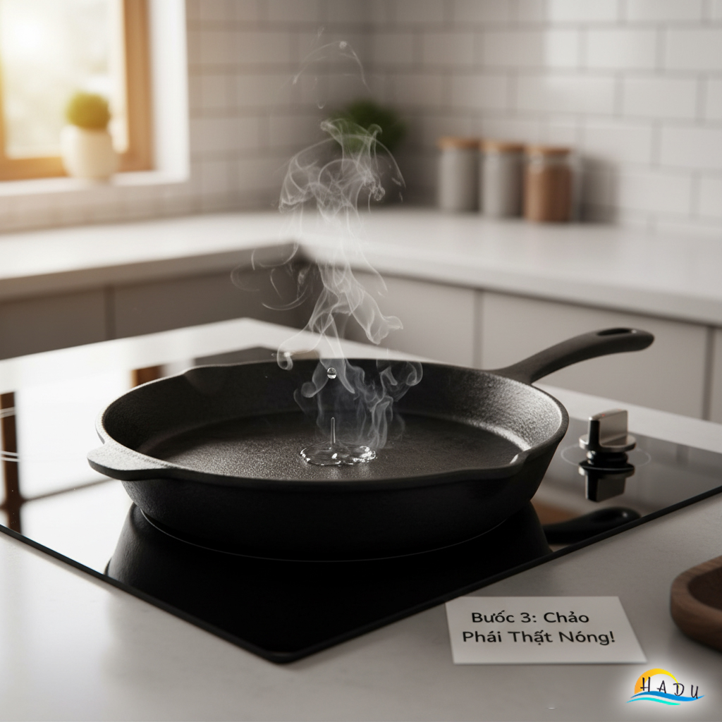 Thử nhiệt: Nhỏ 1-2 giọt nước vào chảo. Nếu nước bốc hơi ngay lập tức (hoặc nhảy múa thành hạt tròn trên chảo thép), chảo đã sẵn sàng.
