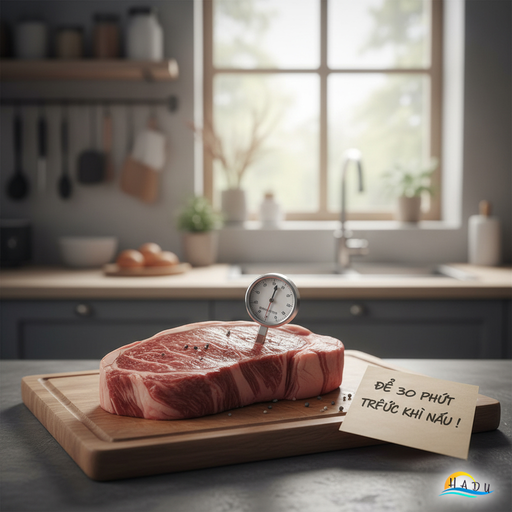 Nhiệt độ phòng: Đây là bước cực kỳ quan trọng. Lấy thịt ra khỏi tủ lạnh ít nhất 30-45 phút trước khi nấu. Nếu thịt quá lạnh, bên ngoài sẽ cháy trước khi bên trong kịp chín.