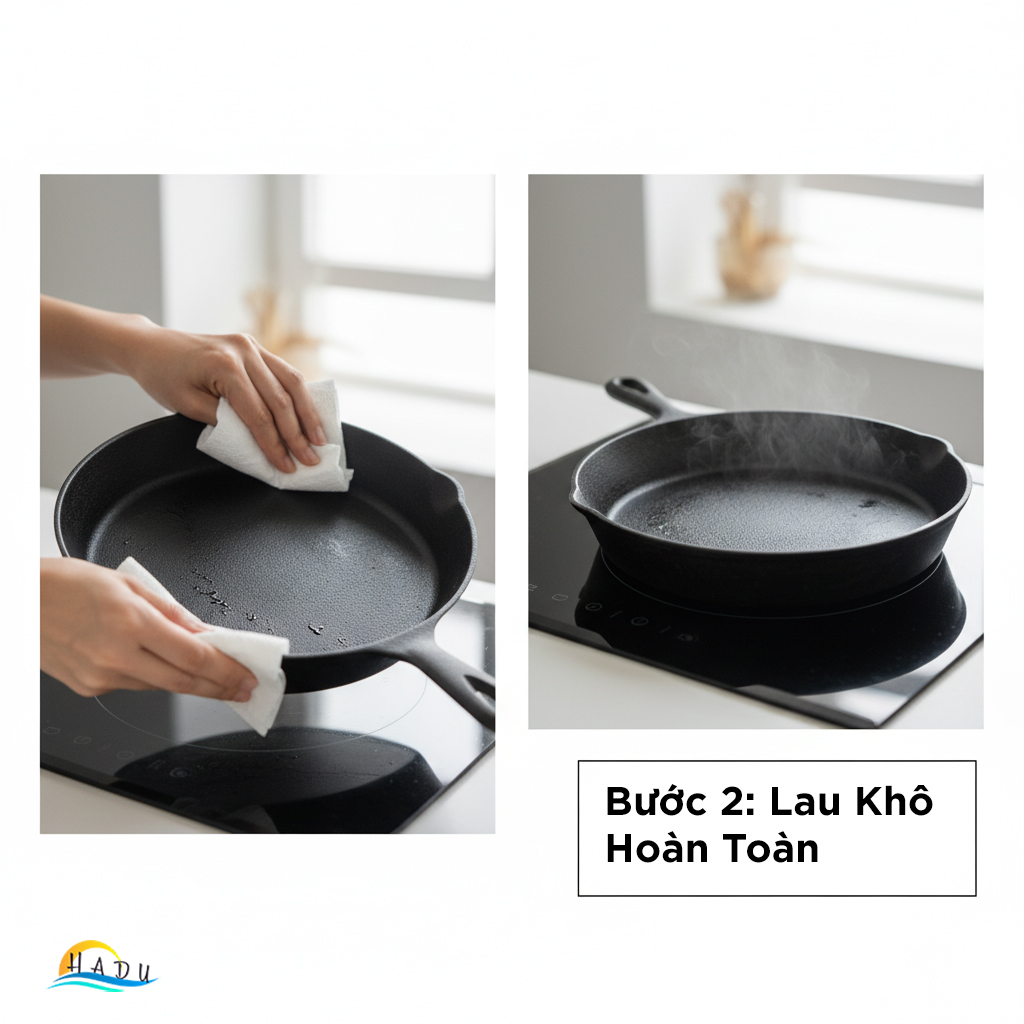 Lau khô: Luôn luôn lau khô chảo ngay sau khi rửa.