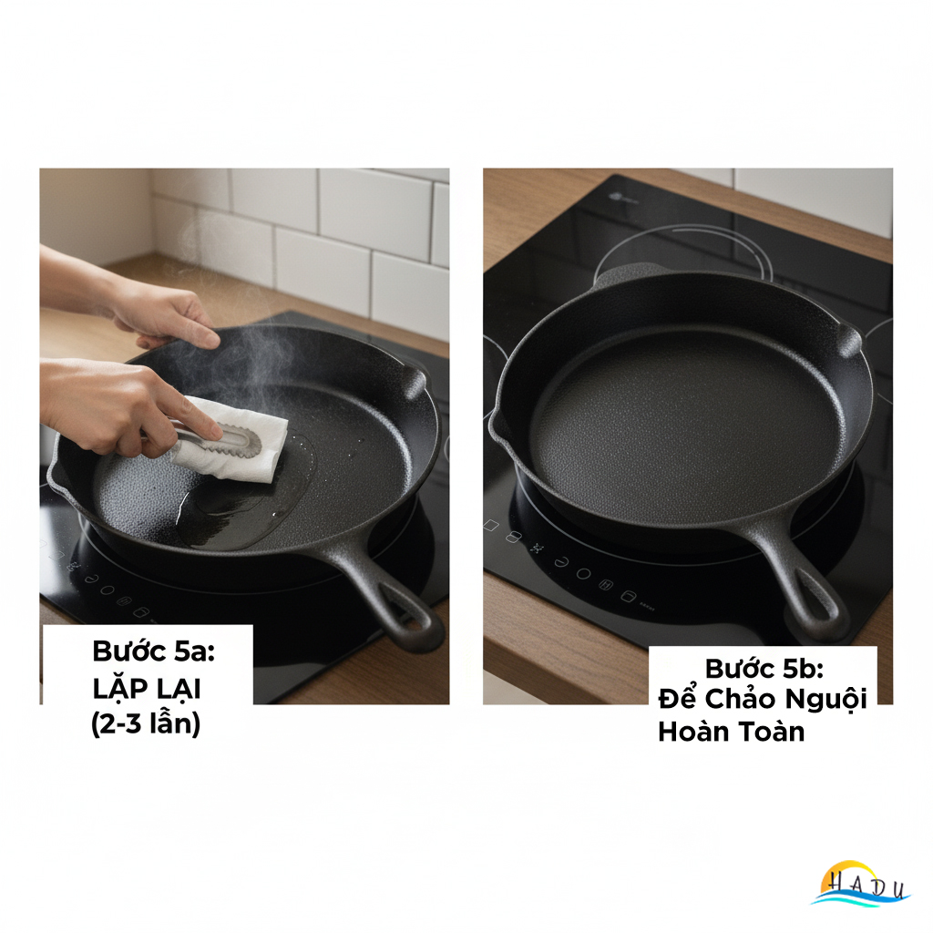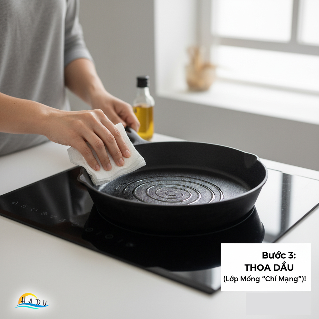 Lưu ý "chí mạng": Lớp dầu phải mỏng đến mức gần như vô hình. Nếu bạn để lại vệt dầu đọng, khi "tôi" chảo, lớp dầu dày sẽ bị dính, nhớt và không thể tạo màng Patina tốt.