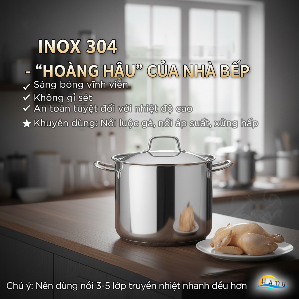 An toàn tuyệt đối: Inox 304 không phản ứng hóa học với thực phẩm, không thôi nhiễm tạp chất ngay cả ở nhiệt độ cao, đảm bảo an toàn tuyệt đối cho sức khỏe người dùng. Đây là lý do nó được sử dụng rộng rãi trong các sản phẩm như nồi luộc gà, nồi áp suất, xửng hấp của Hạ Dương Shop.