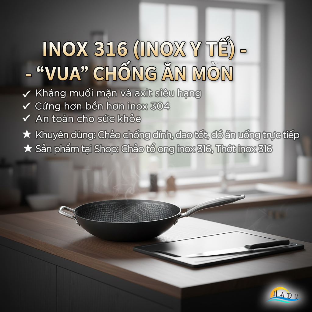 Lựa chọn hàng đầu tại Hạ Dương Shop: Chúng tôi tự hào mang đến các sản phẩm như chảo tổ ong Blackcube, thớt Inox 316 cao cấp được làm từ vật liệu này, đảm bảo độ bền và an toàn tối ưu cho gia đình bạn.