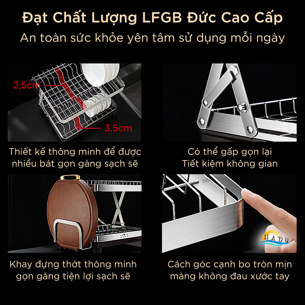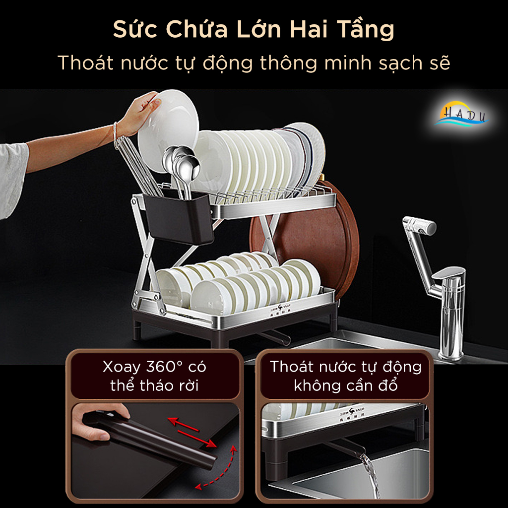 Kệ Bát Đĩa 2 Tầng Gấp Gọn Inox 304 SSGP, Van Thoát Nước Xoay 360°, Kháng Khuẩn, Đạt Chất Lượng LFGB Đức