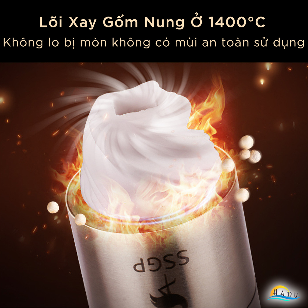 - Chất Liệu Cao Cấp: Inox 304 chống gỉ, bền bỉ, kết hợp với lõi xay gốm nung ở nhiệt độ cao 1400°C, không lo bị mòn, không có mùi.