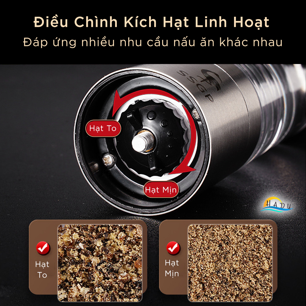 - Chất Lượng Cao Cấp: Được làm từ inox 304 chống gỉ, bền bỉ, kết hợp với lõi xay gốm nung ở nhiệt độ cao, giúp xay tiêu một cách mượt mà và lâu dài.