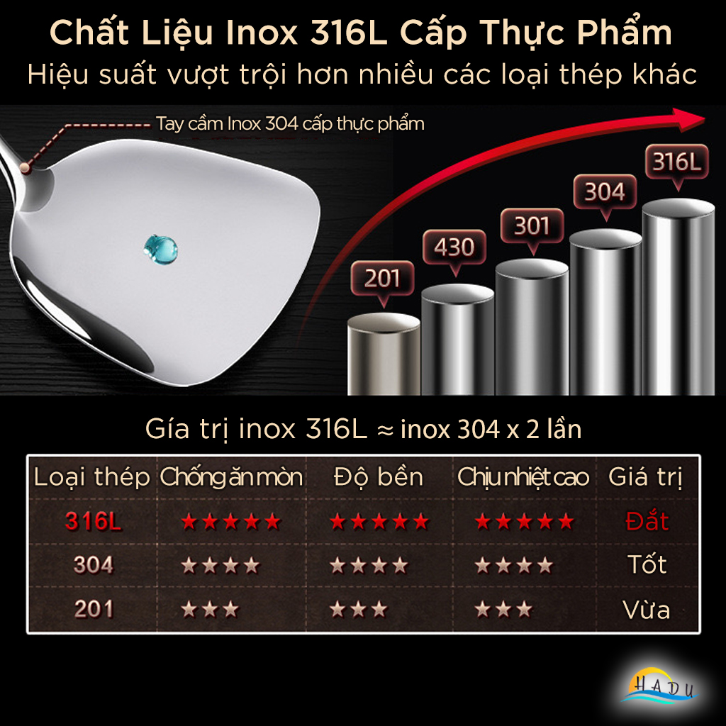 ✔️ Chất Liệu Inox 316L Cao Cấp: Đạt tiêu chuẩn LFGB Đức, an toàn cho sức khỏe, chống mài mòn và ăn mòn, độ cứng cao hơn.