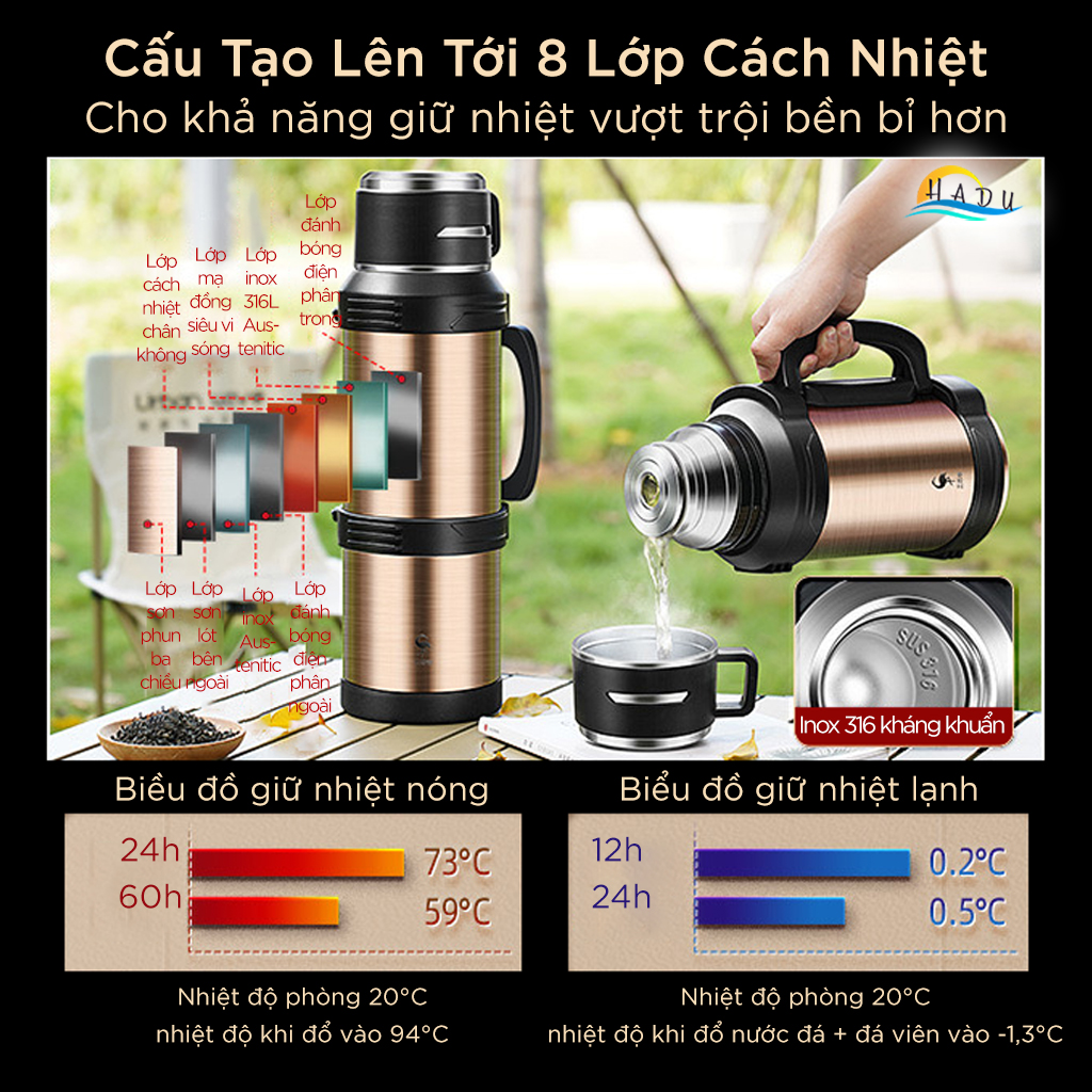 - 8 Lớp Cách Nhiệt: Giữ nước nóng lên đến 60h, giúp bạn thưởng thức nước nóng lâu dài.