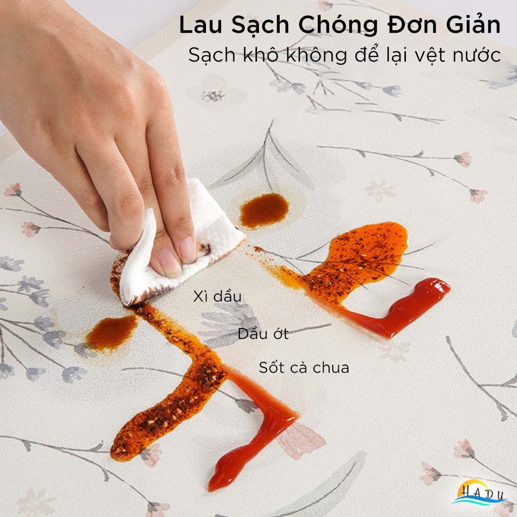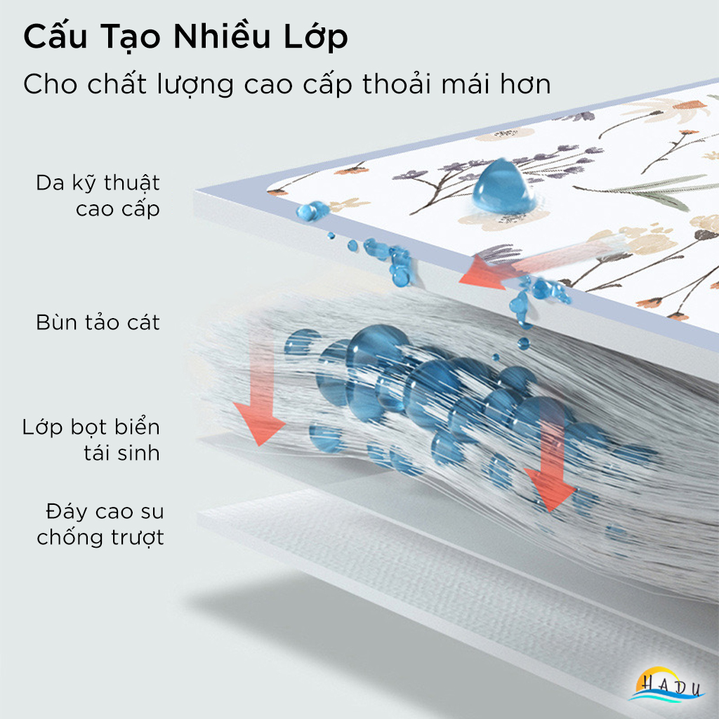✔️ Cấu Tạo Nhiều Lớp Cao Cấp: Da kỹ thuật, bùn tảo cát, bọt biển tái sinh, và đáy cao su chống trượt giúp thảm bền bỉ, hấp thụ nước nhanh chóng và giữ cho bếp luôn sạch sẽ.