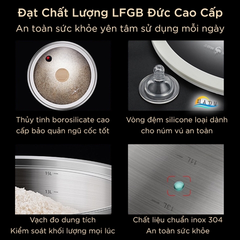- Nắp Thủy Tinh Borosilicate: Giúp bảo quản ngũ cốc lâu dài và giữ nguyên hương vị.
