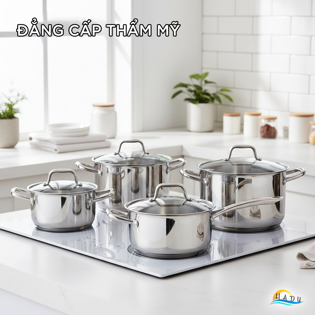 Đây là lợi ích thấy rõ nhất. Một bộ nồi được thiết kế đồng bộ - từ chất liệu inox sáng bóng, kiểu dáng tay cầm, đến độ dày thành nồi - ngay lập tức mang lại vẻ đẹp sang trọng, tinh tế và chuyên nghiệp cho căn bếp.