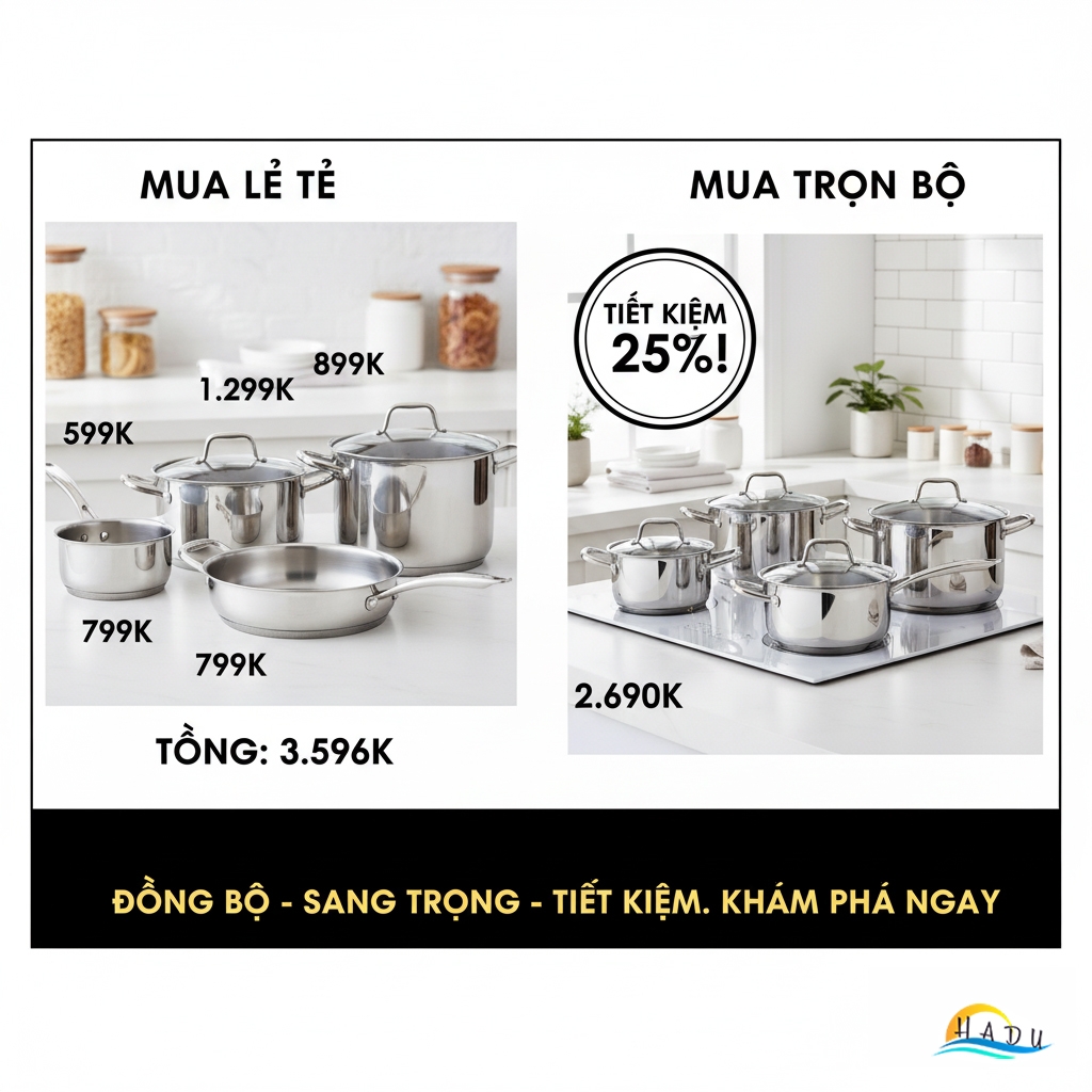 Đây là một bài toán kinh tế đơn giản. Mua một bộ sản phẩm (bundle) luôn có mức giá ưu đãi hơn từ 15-30% so với việc bạn mua từng chiếc nồi riêng lẻ có cùng chất lượng.