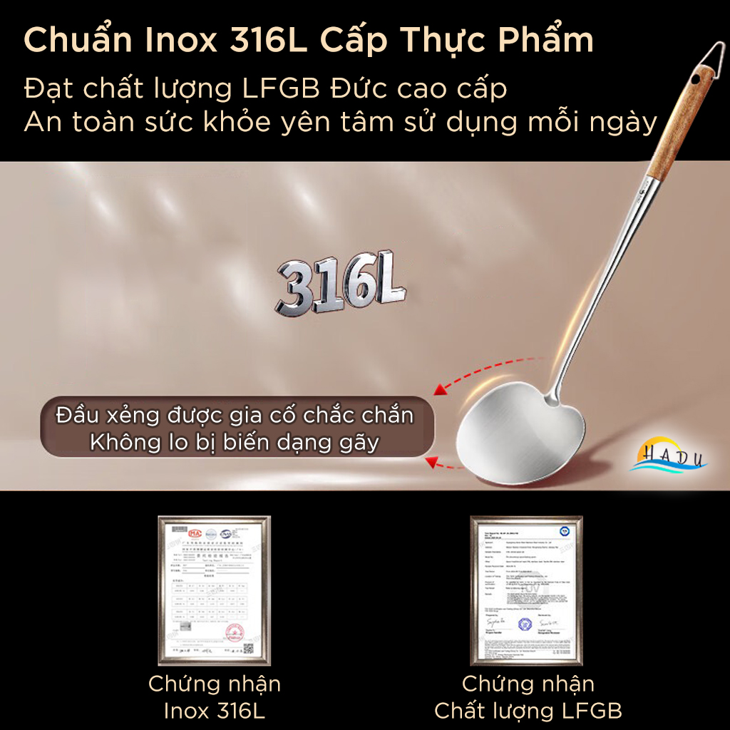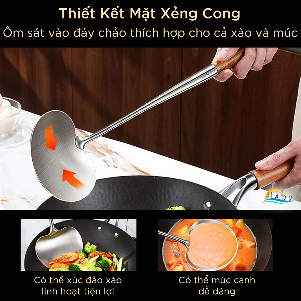 Xẻng Nấu Ăn Inox 316L SSGP Cán Gỗ Cách Nhiệt, Sạn Xào Mặt Cong Lòng Sâu Múc Canh Đa Năng 2in1